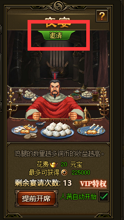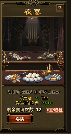 夜宴活动是需要玩家与好友互动的一个小游戏,夜宴的参与人数越多,铜币收益也就越高,玩家点击夜宴的宴请按钮可创建一场夜宴