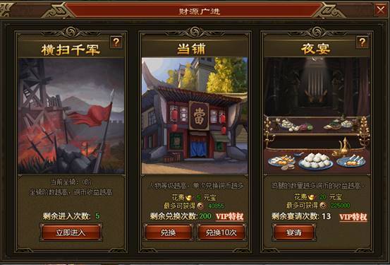 当铺是游戏中获得铜币收益最大的地方,玩家每次需要消耗一定的元宝兑换一次铜币,玩家每天可兑换铜币的次数是有限的,如果你的VIP等级越高,每天可兑换的次数也越多