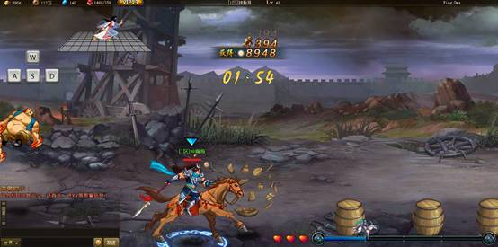 玩家点击横扫千军标签页的进入按钮进入游戏后,控制键盘方向键上、下、左、右来冲撞场景中的障碍物和敌军,冲撞的障碍物和敌军越多获得的铜币收益也越高。