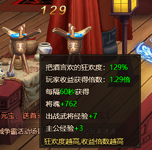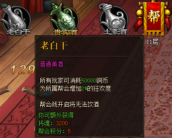 玩家进入把酒言欢活动场景后,可以选择使用美酒增加本帮会在本次把酒言欢的狂欢度,狂欢度越高本帮玩家在活动中的收益也会越高,其中老白干和土豪酒每次活动每位帮会成员只可以使用1次